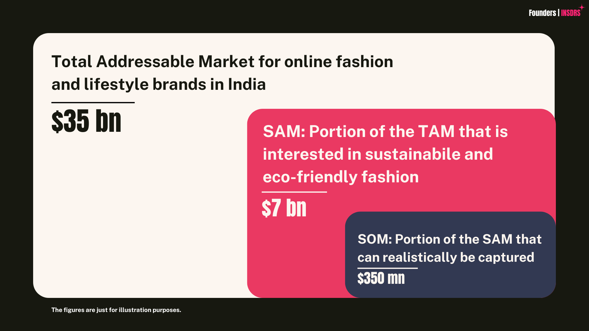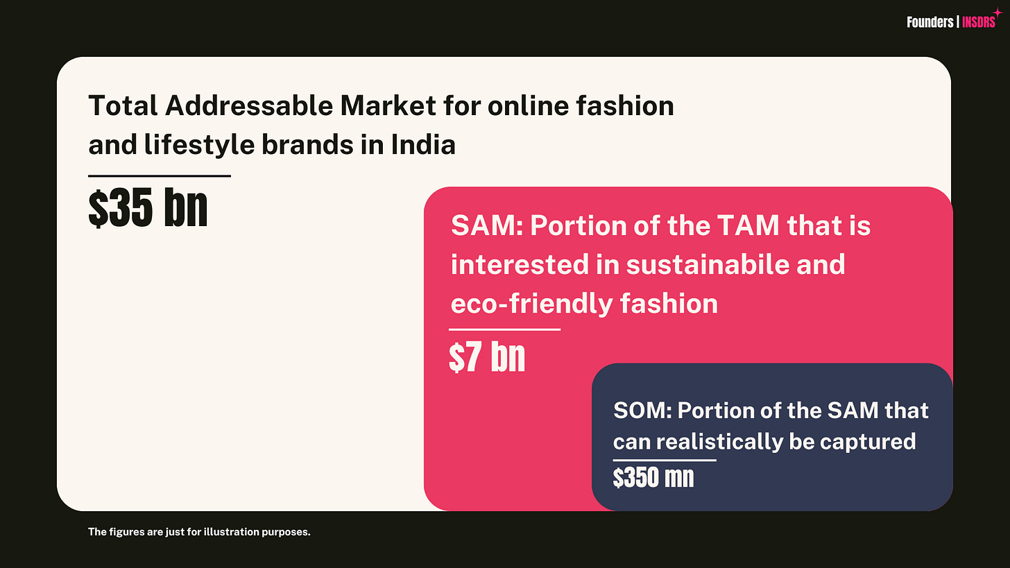 Example: If our D2C fashion brand specializes in sustainable and eco-friendly apparel, its SAM would be the portion of the Indian online fashion market that is interested in sustainability. Considering the growing awareness and preference for sustainable products among Indian consumers, this segment is expanding. If sustainable products represent about 20% of the online fashion market, the SAM for our D2C brand would be 20% of the $35 billion TAM, equating to $7 billion.